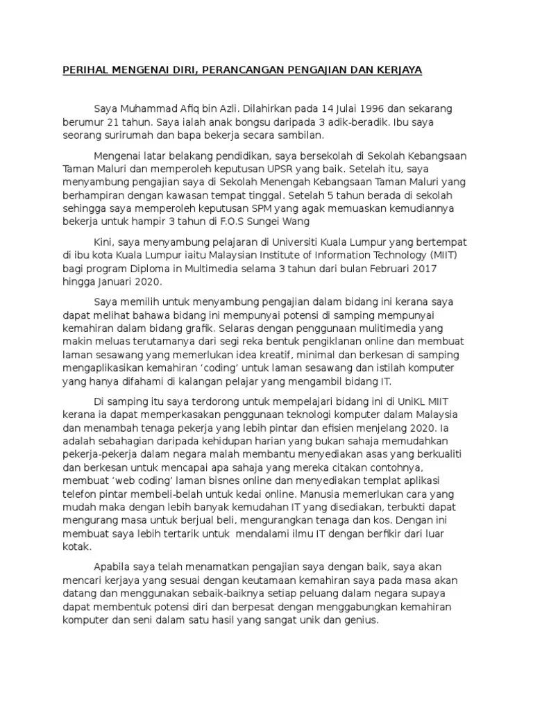 Karangan mengenai perihal diri, perancangan pengajian dan kerjaya kehidupan saya bermula. Diri saya nama saya izani ahmad.